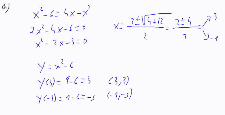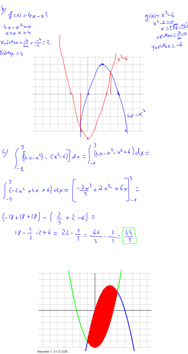 3. (2009-juny-3) 2. Considereu les corbes y = 4x - x2 i y = x2 - 6. a) Trobeu-ne els punts d'intersecció. b) Representeu les dues corbes en una mateixa gràfica, on es vegi clarament el recinte que limiten entre elles. c) Trobeu l'àrea d'aquest recinte limitat per les dues corbes. [0,5 punts per l'apartat a; 0,5 punts per l'apartat b; 1 punt per l'apartat c]