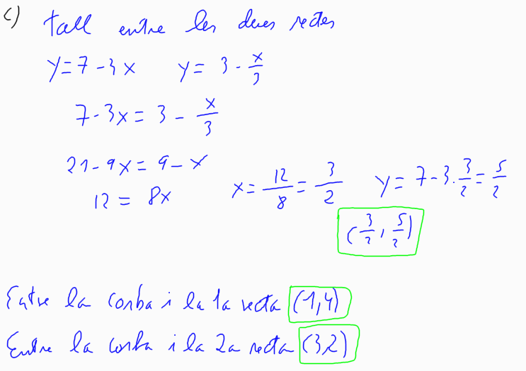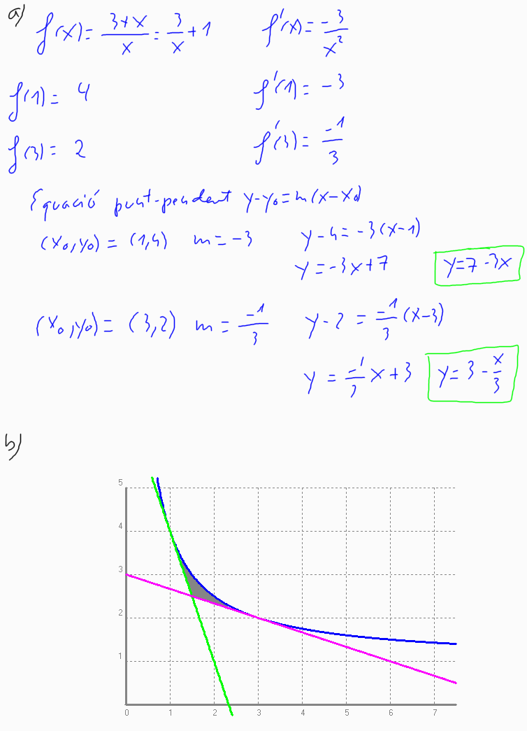 a) Calculeu l'equació de les rectes tangents a aquesta funció en els punts d'abscissa x = 1 i x = 3. b) Dibuixeu el recinte limitat per la gràfica de la funció i les dues rectes tangents que heu calculat. c) Trobeu els vèrtexs d'aquest recinte. d) Calculeu la superfície del recinte damunt dit. [1 punt per l'apartat a; 0,5 punts per l'apartat b; 1 punt per l'apartat c; 1,5 punts per l'apartat d ]