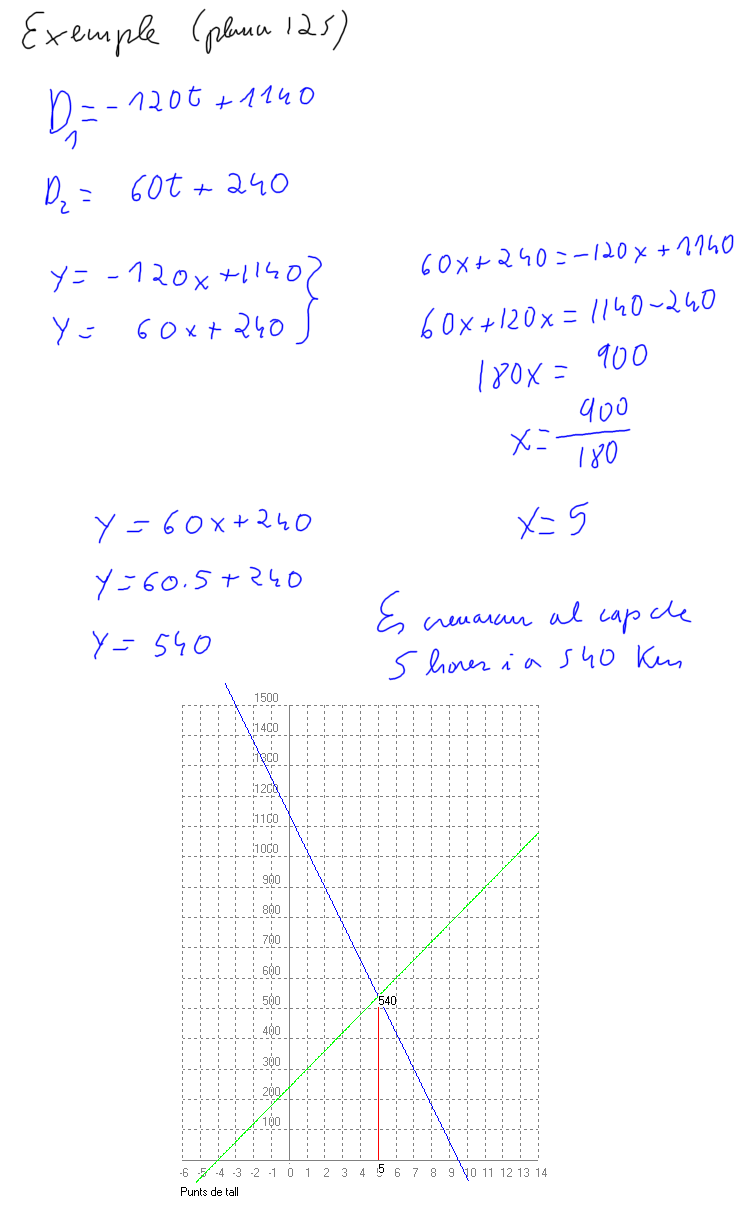 Matemàtiques - 3 ESO - Tema 6 - Funcions Lineals i afins - 6.7 - Estudi conjunt de dues funcions - Exemple de cinemàtica. Quan es troben dos trens que es mouen amb velocitat constant? (plana 125):