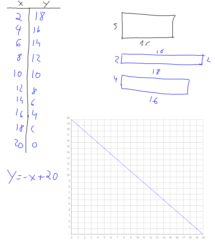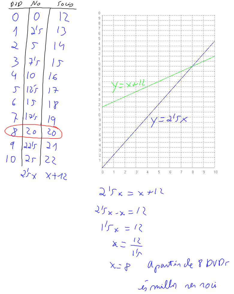 Matemàtiques - Tema 6 - Funcions Lineals i afins - Exemples introductoris 1-Un videoclub té dues modalitats de lloguer: 1a, ser soci que val 12 € més un 1 € per cada DVD o 2a, no ser soci a 2'5€ el DVD. Fes la taula, representa la gràfica, digues a partir de quants DVDs és millor ser soci que no ser-ho i escriu la fórmula de les dues funcions, cost en funció del número de DVDs llogats. ![]() 3-Fer la taula, la gràfica i trobar la fórmula de la funció que ens diu la base en funció de l'altura d'un rectangle si el perímetre val 40 cm. ![]() |