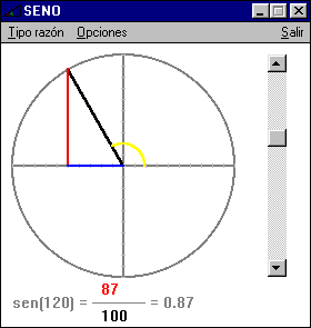 Anterior. Siguiente. Índice Trigonometría Razones trigonométricas de un ángulo cualquiera Para definir las razones trigonométricas de un ángulo mayor de 90º no podemos hacerlo a través de un triángulo rectángulo ya que no pude tener un ángulo mayor de 90º. Vamos a definir de nuevo las razones trigonométricas de un ángulo de manera que sirva para cualquier ángulo y sea equivalente a la definición anterior para ángulos entre 0º y 90º. Dibujemos una circunferencia de radio 1 en un sistema de ejes de coordenadas cartesianas. Cada punto de la circunferencia representa un ángulo.