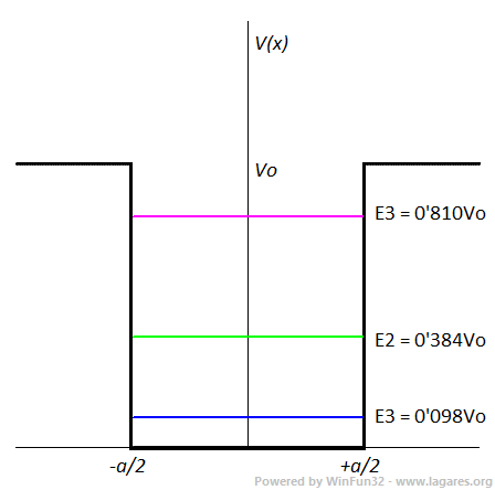 Solució analítica de l'equació d'Schrödinger independent del temps per al potencial d'un pou quadrat Física Cuántica "Eisberg-Resnick" (1974-Ed. Limusa) $$ V(x)=\begin{cases} V_0 \qquad x < -\frac{a}{2} \quad \text{o} \quad x > \frac{a}{2}\\ \\ 0 \qquad -\frac{a}{2} < x < \frac{a}{2} \end{cases} $$ ![]() El potencial 0 L'equació d'Schrödinger independent del temps: $$ -\frac{\hbar^2}{2m} \frac{d^2\varphi(x)}{dx^2} = E\varphi(x) $$ Les solucions de les funcions d'ona, `\Psi(x,t)`, són: $$ \varPsi(x,t)=\varphi(x)e^{-iEt/\hbar} $$ Pels arguments de plausibilitat que van portar a l'equació d'Schrödinger se sap que la funció d'ona d'una partícula lliure és: (*) $$ \varPsi(x,t)=cos(kx-\omega t) + i sin(kx - \omega t) $$ Expresant-ho com una exponencial complexa: $$ \varPsi(x,t)=e^{i(kx-\omega t)} = e^{ikx} · e^{-i\omega t} $$ El nombre d'ona `k` i la freqüència angular són: $$ k=\frac{p}{\hbar}=\frac{\sqrt{2mE}}{\hbar} \qquad \text{i} \qquad \omega = \frac{E}{\hbar} $$ $$ \varPsi(x,t)=e^{i(kx-\omega t)} = e^{ikx} · e^{-iEt/\hbar} $$ Si ho comparem anb la solució general tenim: $$ \varPsi(x,t)=\varphi(x)e^{-iEt/\hbar} = e^{ikx} · e^{-iEt/\hbar} $$ El que implica que: $$ \varphi(x) = e^{ikx} $$ Amb tot això: La solució general per a la regió interior del pou és (combinació lineal de les solucions anteriors): $$ \varphi(x)=A e^{ik_1x}+Be^{-ik_1x} \qquad \text{on} \qquad k_1=\frac{\sqrt{2mE}}{\hbar} \qquad \text{per} \qquad \frac{-a}{2} < x < \frac{a}{2} $$ Es pot demostrar que això és equivalent a: (1) $$ \varphi(x)=A' sin(k_1x) + B' cos(k_1x) \qquad \text{on} \qquad k_1=\frac{\sqrt{2mE}}{\hbar} \qquad \text{per} \qquad \frac{-a}{2} < x < \frac{a}{2} $$ Per a les solucions a les regions externes i fent servir raonaments equivalents, es pot demostrar: (**) $$ \varphi(x)=C e^{k_{11}x}+De^{-k_{11}x} \qquad \text{on} \qquad k_{11}=\frac{\sqrt{2m(V_0-E)}}{\hbar} \qquad \text{per} \qquad x < \frac{-a}{2} $$ i $$ \varphi(x)=F e^{k_{11}x}+Ge^{-k_{11}x} \qquad \text{on} \qquad k_{11}=\frac{\sqrt{2m(V_0-E)}}{\hbar} \qquad \text{per} \qquad x > \frac{+a}{2} $$ `D` i `F` han de ser `0`, sinó la segona i primera exponencial tendirian a `+\infty`. Així per a les regions externes del pou les solucions són: (2) $$ \varphi(x)=C e^{k_{11}x} \qquad \text{on} \qquad k_{11}=\frac{\sqrt{2m(V_0-E)}}{\hbar} \qquad \text{per} \qquad x < \frac{-a}{2} $$ i $$ \varphi(x)= Ge^{-k_{11}x} \qquad \text{on} \qquad k_{11}=\frac{\sqrt{2m(V_0-E)}}{\hbar} \qquad \text{per} \qquad x > \frac{+a}{2} $$ A partir de considerar la continuïtat i derivabilitat de les funcions (1) i (2) en `-a/2` i `a/2` veurem que dins del pou les funcions d'ona permeses són numerables i finites. A (1) canviarem `A'` i `B'` per `A` i `B` i posant la condició de que siguin contínues a `-a/2` i a `a/2 =>`. Cal recordar que `sin(-a)=-sin(a)` i `cos(-a)=cos(a)`. $$ \varphi(-a/2)=-A sin(k_1a/2) + B cos(k_1a/2) = Ce^{-k_{11}a/2} $$ $$ \varphi(a/2)=A sin(k_1a/2) + B cos(k_1a/2) = Ge^{-k_{11}a/2} $$ Si ara posem la condició que les derivades siguin contínues en `-a/2` i `a/2`. $$ \varphi'(-a/2)=Ak_1 cos(k_1a/2) + Bk_1 sin(k_1a/2) = Ck_1e^{-k_{11}a/2} $$ $$ \varphi'(a/2)=Ak_1 cos(k_1a/2) - Bk_1 sin(k_1a/2) = -Gk_1e^{-k_{11}a/2} $$ Si restem la segona de la primera: (1) $$ 2Asin(k_1a/2)=(G-C)e^{-k_{11}a/2} $$ I si les sumem: (2) $$ 2Bcos(k_1a/2)=(G+C)e^{-k_{11}a/2} $$ Restant la 4a de la 3a: (3) $$ 2Bk_1sin(k_1a/2)=(G+C)k_{11}e^{-k_{11}a/2} $$ I sumant-les: (4) $$ 2Ak_1cos(k_1a/2)=-(G-C)k_{11}e^{-k_{11}a/2} $$ Exigint que `B \ne 0` i `(G+C) \ne 0` podem dividir (3) ente (2): (5) $$ k_1tan(k_1a/2) = k_{11} $$ Exigint que `A \ne 0` i `(G-C) \ne 0` podem dividir (4) ente (1): (6) $$ k_1cotan(k_1a/2) = -k_{11} $$ Si sumen aquestes dues equacions: $$ k_1tan(k_1a/2) + k_1cotan(k_1a/2) = 0 $$ $$ tan(k_1a/2) + cotan(k_1a/2) = 0 $$ Ho multipliquem tot per tan(`k_1`a/2) $$ tan^2(k_1a/2) + 1 = 0 $$ $$ tan^2(k_1a/2) = -1 $$ Això no té solució si `k_1` i `a/2` són reals, que és el cas. Per la qual cosa, les equacions (5) i (6) no es poden satifer simultàniament. Si considerem (5) correcta, 1a classe, el que implica que `A=0` i `G-C=0` tindrem unes solucions: $$\begin{cases} k_1tan(k_1a/2) = k_{11}\\ A=0\\ G-C=0 \end{cases} $$ Agafem l'equació, `\varphi(a/2)=A sin((k_1a)/2) + B cos((k_1a)/2) = Ge^((-k_(11)a)/2)`, i si ` A= 0` i `G = C`: $$ B cos(k_1a/2) = Ge^{-k_{11}a/2} $$ $$ G = Bcos(k_1a/2) e^{k_{11}a/2} = C $$ I amb tot plegat les eigenfuncions són: $$ \phi(x)\begin{cases} [Bcos(k_1a/2) e^{k_{11}a/2}]e^{k_{11}x} \qquad \text{si} \qquad x < \frac{-a}{2}\\ \\ Bcos(k_1x) \qquad \text{si} \qquad \frac{-a}{2} < x < \frac{a}{2}\\ \\ [Bcos(k_1a/2) e^{k_{11}a/2}]e^{-k_{11}x} \qquad \text{si} \qquad x > \frac{a}{2}\\ \end{cases} $$ Si considerem (6) correcta, 2a classe, el que implica que `B=0` i `G+C=0` tindrem unes solucions: $$\begin{cases} k_1cotan(k_1a/2) = -k_{11}\\ B=0\\ G+C=0 \end{cases} $$ Agafem l'equació, `\varphi(a/2)=A sin((k_1a)/2) + B cos((k_1a)/2) = Ge^((-k_(11)a)/2)`, i si ` B= 0` i `G = -C`: $$ A sin(k_1a/2) = Ge^{-k_{11}a/2} $$ $$ G = Asin(k_1a/2) e^{k_{11}a/2} = -C $$ I amb tot plegat les eigenfuncions són: $$ \phi(x)\begin{cases} [-Asin(k_1a/2) e^{k_{11}a/2}]e^{k_{11}x} \qquad \text{si} \qquad x < \frac{-a}{2}\\ \\ Asin(k_1x) \qquad \text{si} \qquad \frac{-a}{2} < x < \frac{a}{2}\\ \\ [Asin(k_1a/2) e^{k_{11}a/2}]e^{-k_{11}x} \qquad \text{si} \qquad x > \frac{a}{2}\\ \end{cases} $$ Recordant que: $$ k_1=\frac{\sqrt{2mE}}{\hbar} \qquad \text{ i } k_{11}=\frac{\sqrt{2m(V_0-E)}}{\hbar} $$ I ho posem a: $$ k_1tan(k_1a/2) = k_{11} $$ Multiplicant per `a/2` a cada costat: $$ \sqrt{\frac{mEa^2}{2\hbar^2}}tan\sqrt{\frac{mEa^2}{2\hbar^2}} = \sqrt{\frac{m(V_0-E)a^2}{2\hbar^2}} $$ Recordem que volem trobar els valors de `E` que són solució d'aquesta equació. Això és una equació trascendent la qual cosa implica que es pot resoldre de forma gràfica (numèrica ;-), no de forma analítica. Per fer-ho farem uns canvis: $$ \xi = 