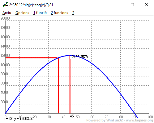 Com anècdota dir que vaig fer la mili a artilleria (Ramix32, Melilla) i que mai els meus coneixements balístics van ser fets servir. De fet mai no vaig disparar, ni vaig veure disparar, cap canó. Com ho va fer Galileu per arribar a aquest model? Va fer experiments amb plans inclinats i deixant anar un objecte intentant que la superfície fos el més lliscant possible i se'n va adonar que si, en un interval de temps donat, el primer, recorria una certa distància, el segon mateix interval recorria `3` vegades la primera distància i el tercer mateix interval ecorria `5` vegades la primera distància. Si ho posem en una taula. $$ \begin{pmatrix} Interval & distància\\\ 1r & 1\\\ 2n & 3\\\ 3r & 5\\\ 4t & 7\\\ 5t & 9\\\ 6t & 11\\\ 7t & 13 \end{pmatrix} $$ Si ara el que fem és posar la distància total recorreguda fins: $$ \begin{pmatrix} temps & total\\\ 1 & 1\\\ 2 & 4\\\ 3 & 9\\\ 4 & 16\\\ 5 & 25\\\ 6 & 36\\\ 7 & 49 \end{pmatrix} $$ Observem que la distància en funció del temps segueix una fórmula proporcional al quadrat del temps. `d(t)=t^2` Si en lloc de fer servir un pla inclinat fem caiguda lliure (la llegenda diu que en Galileu va fer servir la torre inclinada de Pisa per fer les mesures de la caiguda d'un cos, tot i que en caiguda lliure de seguida els resultats no concorden degut a la forta força de frenada que fa l'aire), i fent servir les unitats actuals de mesura, segons i metres (recordeu que en època de Galileu encara, "1564-1642", no s'havia inventat el metre "circa 1800", la fórmula de la distància recorreguda en funció del temps, en el vuit, és: `d(t)=1/2g·t^2` Això es pot demostrar, per culpa de la dictadura de les matemàtiques, que correspont a un moviment amb acceleració constant. En el nostre cas l'acceleració val `g`. A partir d'això (i unes cuantes lleis tiraniques de les matemàtiques* ;-) pot deduir la fórmula que hem fet servir abans: `d(\alpha)=(v_i^2·sin(2\alpha))/g` *Recordem que les lleis dictades pel govern de les matemàtiques són d'obligat compliment. ;-) |