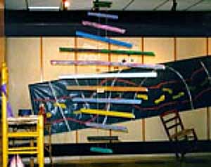 a l'esquerra estava el racó de la llum. El mural del fons es va fer amb pintura i les marques de les rodes de la cadira de l'Ana i els peus de l'Isra