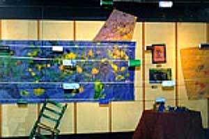 el mural es va fer amb pintura i els peus del Juan i la Nuria. Al voltant hi ha d'altres creacions com ara un estel i diversos quadres