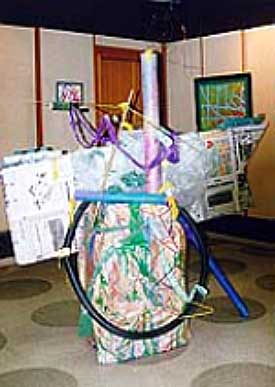 aquesta és l'escultura, feta de caixes folrades am paper de diari plāstics pintats, tubs, penjadors,...