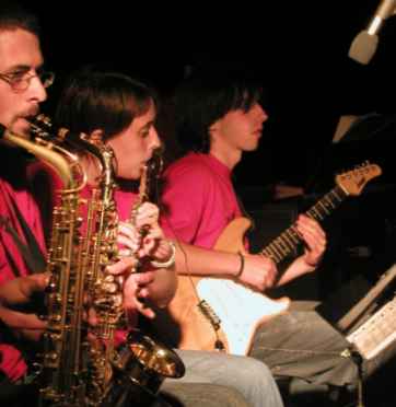 L'Àngel Giralt al saxo alt, l'Íngrid Pujol a la flauta i en Bernat Riera a la guitarra |