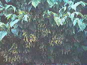 | Fulla: Simple, oposada, amb tendència a caure, grans, llargament peciolades i sense estípules.Flor: Es troben conjuntament amb les fulles. D'un color verd-grogenc, presenten pedúncles lampinyats i solen penjar. Fruit: De doble sàmara i no estàn subjectes a la base. |
