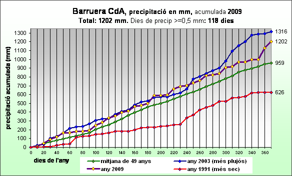 | Al gràfic s'hi mostra la precipitació acumulada en intervals de 10 dies. En bru, l'any 2009. En verd, la mitjana de 49 anys . Any de precipitacions superiors a la mitjana gairebé en 250 mm. Destaquem les precipitacions de desembre, que ha estat el tercer més humit de la sèrie . | |