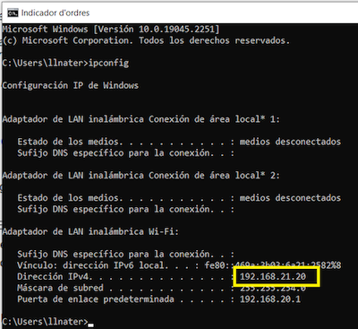 1 Escriu ipconfig i veuràs a la IP que estàs connectat