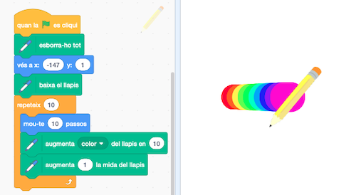 Programació per dibuixar una línia ampliant mida del llapis i canviant colors