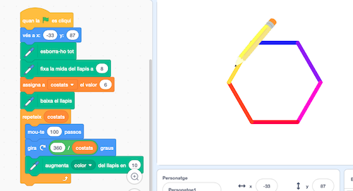Programació per si vols dibuixar un hexàgon de colors. En el menú de variables, trobaràs com crear-la.