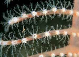 Figura 8.- Imatge d'un pòlip solitari (Urticina sp.) (esquerra) i de zoides d'una colonia (Pennatula) (dreta). Fotografia d'Erling Svensen |