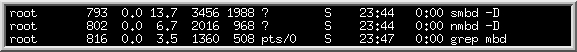 Monitorització general via línia de comandes Per accedir a aquest nivell de monitorització cal tenir accés al teclat i pantalla del servidor o poder obrir una sessió telnet o ssh (secure shell, substitut encriptat del Telnet) contra ell. Proposem una pauta de control: 1.- Verificació de l'estat dels processos smbd i nmbd Amb les ordres ps i top comprovarem l'estat dels processos smbd i nmbd, si està executant-se i quants recursos del sistema utilitzen. Així executant, # ps -aux | grep mbd ens mostraria