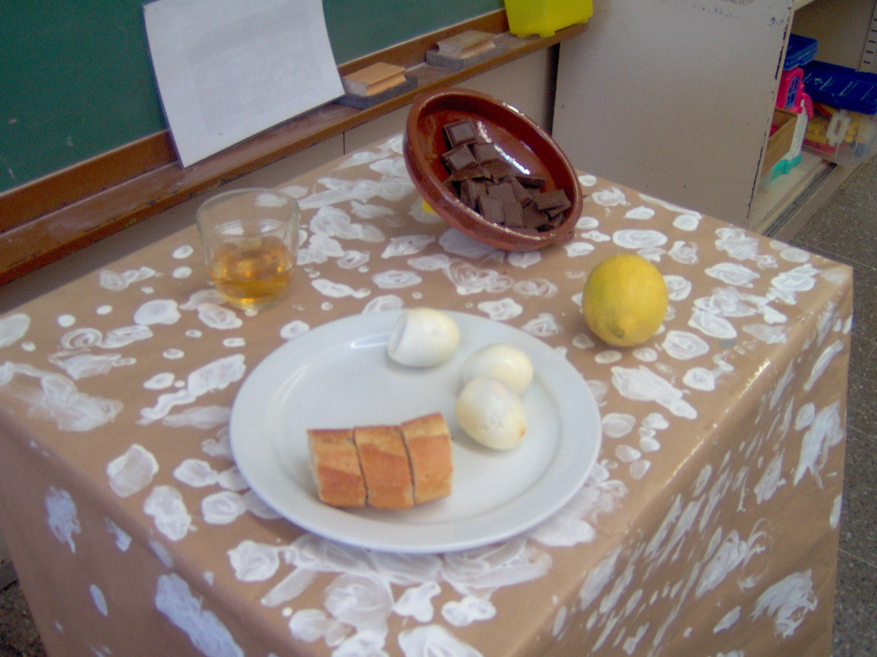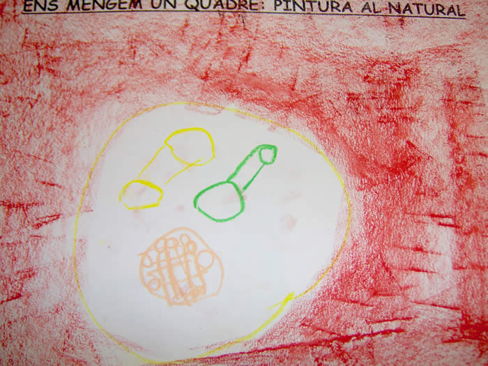 UN COP TRIATS ELS QUADRES A LA SESSIÓ SEGÜENT LES TITELLES VAN PORTAR UNA CAPSA AMB LA REPRODUCCIÓ TRIADA I ELS INGREDIENTS NECESSARIS PER MENJAR EL QUADRE. ABANS PERÒ EXPLIQUEM COM HO FEIEN ELS ARTISTES QUAN PINTAVEN UN BODEGÓ. NOSALTRES FEM COM ELLS: PREPAREM EL NOSTRE QUADRE AMB ELS ELEMENTS QUE HEM PORTAT PERQUÈ ABANS DE MENJAR-LO L'HEM DE PINTAR... |