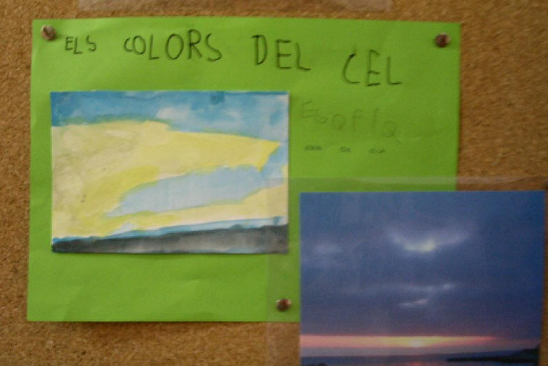 “Com veis, el cel pot ser blau, groc, vermell, amb núvols grisos, negre, blau i groc, lila, blanc…” “Els diferents colors del cel, ens diuen quin temps farà. Si farà vent, si plourà, si farà pedra…” “Cel empedrat, terra mullat” |