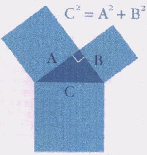 Pitàgores va veure que la suma dels quadrats petits era igual a la del gran. També va veure que si col.locava els quadrats petits formant un angle recte (90 graus), al lligar-los pels vértex, sortia el costat de l'altre quadrat. |