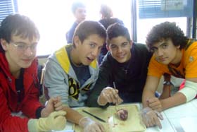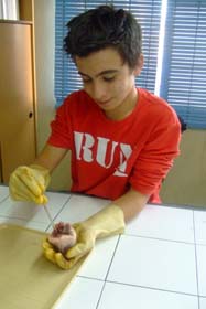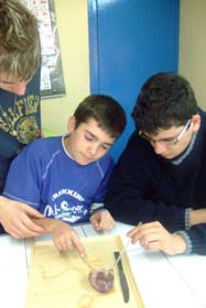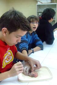 de be 3) Procediment Primera incisió Obrim la part dreta del cor, fem la primera incisió per d'amunt del solc anterior, tallant longitudinalment l'artèria pulmonar. Feta aquesta primera incisió, veiem el ventricle dret i l'artèria pulmonar oberta. L'artèria pulmonar porta la sang sense oxigenar, des de el ventricle dret fins als pulmons. En aquesta situació passem una vareta petita de vidre per la vàlvula tricúspide cap a l'aurícula dreta i, amb molta cura sense fer força, traiem la vareta per al vena cava. La vena cava porta la sang sense oxigenar dels òrgans del cos cap a l'aurícula dreta. Segona incisió Obrim la part esquerre del cor, tanquem la incisió que hem fet de manera que no es vegi el ventricle dret. A continuació, fem una segona incisió just per d'avall del solc anterior. El ventricle esquerre quedarà obert, és possible que també quedi oberta l'aurícula esquerra. Des de l'aurícula fiquem una vareta de vidre i trobem la vena pulmonar (porta la sang oxigenada des dels pulmons fins a l'aurícula esquerra). Des de el ventricle fiquem una altra vareta de vidre cap amunt i trobem l'artèria aorta (porta la sang oxigenada el ventricle esquerre capa als òrgans del cos). 4)