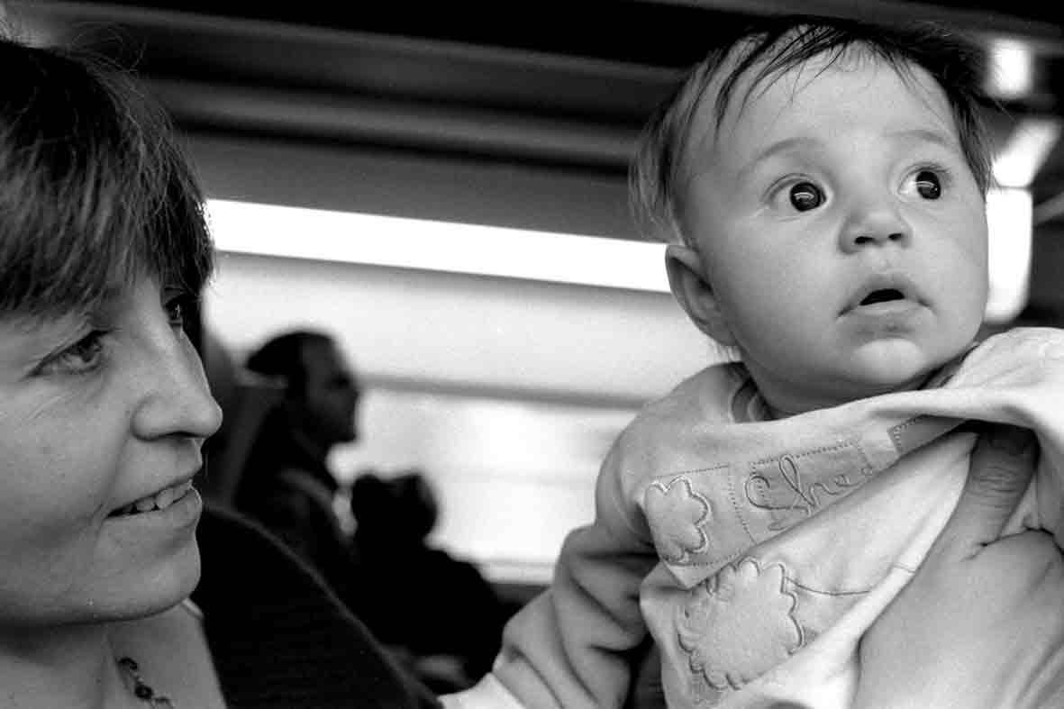 Pour moi, comme vous le savez déjà, l'avion n'avait pas de secret... Par contre, j'ai été totalement éberlué de me réveiller à 5 heures du matin dans le hall de l'aéroport de Barcelone. Je n'en croyais pas mes yeux!! Dans l'avion, on m'a fait asseoir sur les genoux de maman et on m'a donné une ceinture spéciale, en me donnant la consigne de ne pas bouger au décollage et à l'atterrissage - ce que j'ai fort bien fait, car à ces deux moments précis, maman m'a pris pour me donner le sein (elle dit que c'est pour éviter que mes oreilles se bouchent, moi je trouve ça rudement sympa, l'avion, pour les bébés!!).
