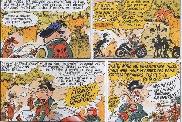 Les motards: LafrimeDans beaucoup de groupes il a y a le fanfaron, le vantard, le frimeur, dit en français familier. Dans notre bande il est représenté par Lafrime, une sorte de pélican amateur des nouvelles technologies appliquées à la moto. Lisez ce gag, vous allez pouffer de rire: