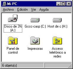 Fent un doble clic a Mi PC apareix una finestra amb diferents icones que representen el contingut de l'ordinador: les unitats de disc locals i de xarxa (si l'ordinador està connectat a una xarxa local), i tres carpetes corresponents al panell de control (per configurar els diferents components del sistema informàtic), a les impressores i l'accés telefònic a xarxes per a connexions remotes.