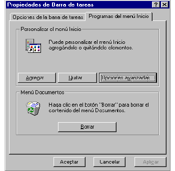 Fent clic sobre el botó Agregar afegim al sistema de menús nous programes. Quitar ens permet eliminar programes del menú i Borrar ens possibilita buidar el contingut de la carpeta documentos.