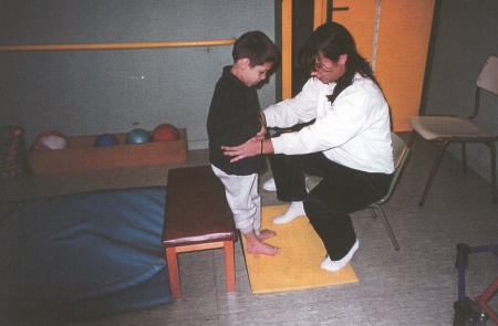 Hemos podido realizar transferencias de peso, tanto a la extremidad mas funcional como en la mas afecta. A pesar de ello, nos ha costado un poco relajar la extremidad que no soportaba peso, ya que el paciente tiene dificultad en doblar la rodilla, disociando el movimiento respeto a la otra extremidad (debido a la cocontracción). Por esa razón, el control y realización de la flexo-extensión de rodilla se la hemos facilitado nosotros, pasivamente, aunque una vez realizada el paciente mantenia perfectamente esa posición (siempre y cuando nosotros le controlaramos su pelvis).