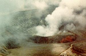 Quan pel cràter d'un volcà surt a l'exterior la màteria sòlida, líquida o gasosa, el volcà està en ERUPCIÓ.