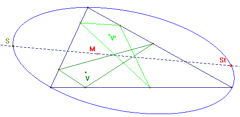 EL centre areal S dels triangles cevians dels punts de Brocard V, V' és a l'el·lipse circumscrita de Steiner i està alineat amb el punt mitjà M entre els punts de Brocard i amb el punt de Steiner St.