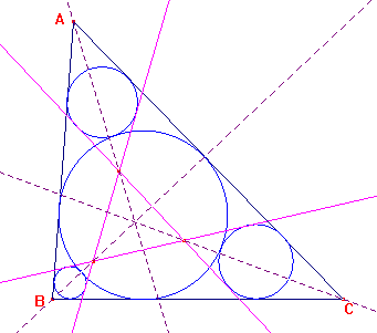 Dibuixem tres circumferències tangents a dos costats i tangents exteriorment a la circumferència inscrita. Les tangents comunes als parells d'aquestes circumferències, diferents dels costats, formen un triangle que està en perspectiva amb ABC.