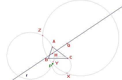 1) Sea Q un punto de r, y X, Y, Z los simétricos de Q en los lados de ABC 2) Las circunferencias {AYZ}, {BZX}, {CXY} se cortan en el punto P buscado.