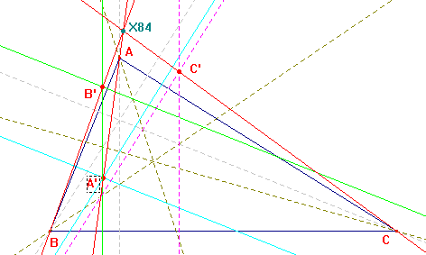 Sea A' la intersección de las simétricas de la A-altura en la B-bisectriz y en la C-bisectriz. Definimos análogamente B', C'. Las rectas AA', BB', CC' concurren en X(84).