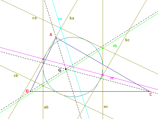 Sean ab, ac, bc, ba, ca, cb las seis tangentes a la circunferencia de los nueve puntos perpendiculares a los lados. Sea ra la recta que une la intersección de ba y ca con la intersección de cb y bc, y definimos análogamente rb, rc. Las paralelas por los vértices a ra, rb, rc concurren en el baricentro G y las paralelas por los puntos medios de los lados a ra, rb, rc concurren en el punto de Spieker Sp.