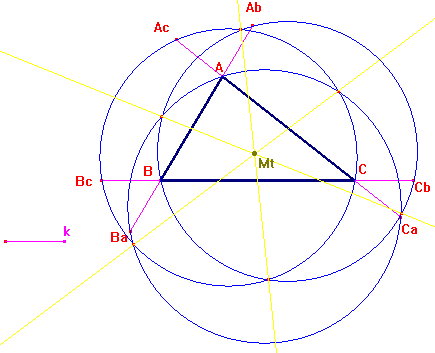 Sean Ab y Ba en la recta AB de forma que AAb = BBa = k; análogamente se definen Bc y Cb, y Ca y Ac. Entonces el centro radical de las circunferencias {ABaCa}, {BCbAb}, {CAcBc} es el punto intermedio Mt.