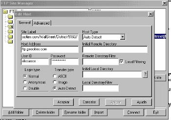 El procediment és molt senzill, primer hem d'establir connexió amb el Host, per exemple si el meu host es geocities, cliquem en "Site Manager" del menú "FTP" i anem a l'opció "Add site", ens demanarà el "Site label" que és l'adreça d'internet on estarà la nostra web, el "Host address que en aquest cas seria "ftp.geocities.com" (hem de substituir el "http://www", per "ftp") posar el nom d'usuari "user id" i la contrasenya "password" (que ens haurà proporcionat el Host) i finalment connectar-nos).