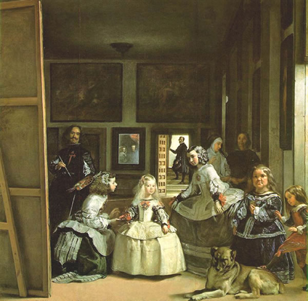 AUTOR: Diego Rodriguez de Silva y Velázquez TÍTOL: Originalment es deia “La Familia” fins que Madrazo li posà “Las Meninas” (1843), terme portuguès que era l’utilitzat a la cort espanyola per designar les donzelles d’honor. CRONOLOGIA: 1656 ESTIL: Barroc (segle d'or hispànic) TÈCNICA I SUPORT: Oli sobre tela MIDES: 318 x 276 cm UBICACIÓ ORIGINAL: Estances privades de Felip IV, a l’alcàsser de Madrid. UBICACIÓ ACTUAL: