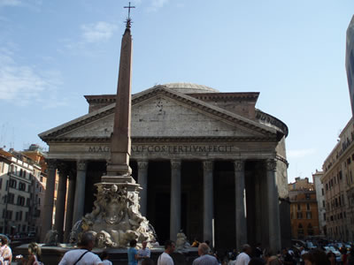 AUTOR: Apolodoro de Damasc. Reconstrucció del temple rectangular i cremat d'Agripa, gendre d'August i ordenat per l'emperador romà Adrià a l'arquitecte Apolodoro de Damasc TÍTOL: Panteó d'Agripa CRONOLOGIA: 120-126 dC ESTIL: Art Romà MATERIALS: Els murs i la coberta són de formigó, revestits de rajola i marbre. Columnes de fust monolític de granit egipci amb bases de marbre blanc i capitells corintis. El terra està revestit de lloses de marbre, granit i pòrfid amb forma de quadrats i cercles. El farcit de la cúpula es fa de formigó (invent romà que barreja cal amb arena volcànica dita puzolana, no anava armat i requeria de contraforts exteriors). El papa Urbano VIII va fer retirar els claus i les plaques de bronze de les bigues del portaló per construir el baldaquí de sant Pere. MIDES: L'alçada és exactament igual que l'amplada (42 m) UBICACIÓ: Roma. |