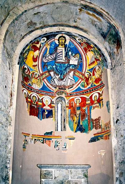 AUTOR: Desconegut (probablement de procedència italiana) TÍTOL: Conjunt iconogràfic de Sant Climent de Taüll CRONOLOGIA: 1123 (es va consagrar l'església) ESTIL: Romànic TÈCNICA I SUPORT: Pintura al fresc, mur MIDES: 770 x 420 x 590cm UBICACIÓ ORIGINAL: Taüll, a la vall de Boí (Alta Ribagorça) |