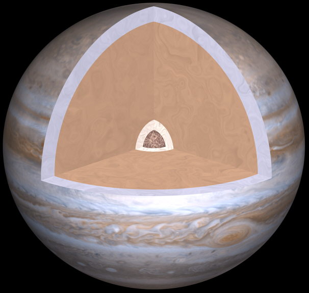 L'atmosfera de Júpiter és molt profunda, comprenent potser al propi planeta, i és d'alguna manera com el Sol. Està composta principalment per hidrogen i heli, amb petites quantitats de metà, amoníac, vapor d'aigua i altres compostos. A grans profunditats dins de Júpiter, la pressió és tan gran que els àtoms d'hidrogen es trenquen alliberant els seus electrons de tal forma que els àtoms resultants estan composts únicament per protons. Això dóna lloc a un estat en el qual l'hidrogen es converteix en metall. La dinàmica del sistema climàtic de Júpiter es reflecteix en unes franges latitudinals de colors, núvols atmosfèrics i tempestes. Els patrons dels núvols canvien en hores o dies.