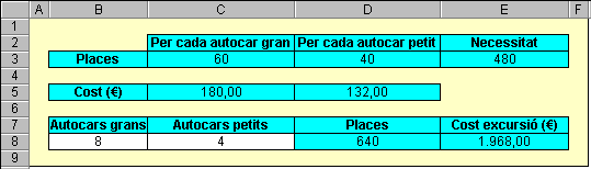 Fixeu-vos que el valor de la cel·la E8 ha de ser mínim i que les cel·les que són variables són la B8 i la C8. No oblideu les restriccions degudes al nombre de places (és possible que algun autocar no vagi ple, però cap persona s'ha de quedar sense plaça), al nombre d'autocars disponibles (només podem disposar, com a màxim, de 6 autocars grans i 9 petits) i als caràcters positiu i enter del nombre d'autocars. |