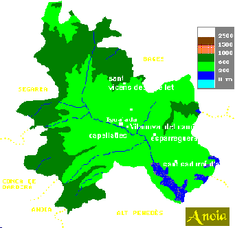 Pren el seu nom del riu Anoia que la drena juntament amb els seus afluents, provocant l'aparició de tres medis físics diferenciats: