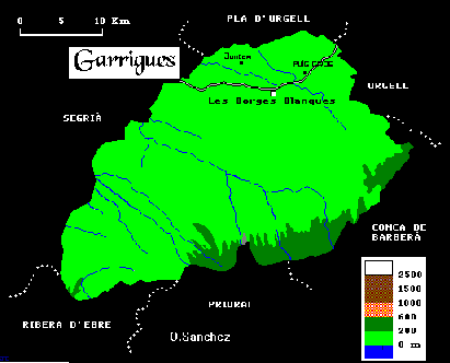 Comarca del Principat, a la regió de Lleida, Cap de la comarca, les Borges Blanques. ÉS constituïda per un planell inclinat cap al NW i enèrgicament dessecat que constitueix l'extrem meridional de la Depressió Central Catalanai, al N, per un sector de la plana d'Urgell. Forma part del vessant esquerre de la Conca del Segre, des de les serres que formen la divisòria d'aigües amb el Francolí: serra la Llena, la més alta (1025m), continuada cap a l'W pels contrafors septentrionals del Montsant. Tanmateix, en dos indrets la comarca ultrapassa aquesta línia divisòria d'aigües: a la vall de Bovera, drenada pel riu de la Cana, afluent de l'Ebre per l'esquerra, i als sectors de Vinaixa i de Tarrés, drenat cap al Francolí i que morfològicament forma part de la Conca de Barberà. El curs d'aigüa més important és el riu Set, afluent del Segre per l'esquerra, el qual té molts torrents tributaris, secs gairebé tot l'any; al N, el barranc de la Femosa es dirigeox cap a Lleida i va a afluir al Segre; drenen encara la comarca els cursos, normalment secs, dels barrancs d'Utxesa i de Carratalà, afluents també del Segre.