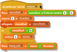 Traurà un resultat a l'atzar entre 1 i 6, afegirà el resultat a la llista, comptarà el nombre de tirades, el nombre de sisos i la freqüència relativa. Això segur que és ben fàcil de fer!