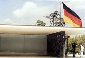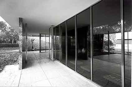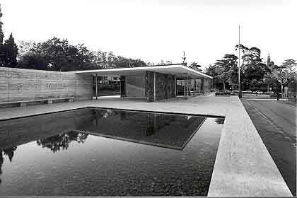 Un espai alemany. El Pavelló és un edifici provisional per fer propaganda de les possibilitats de lArquitectura moderna i donar una certa idea dAlemanya. El Pavelló crea un espai, que és sempre lobjectiu de lArquitectura: obert i tancat, cobert i descobert, amb diferents variacions; és un espai ben pur, molt ben dissenyat però inútil i no val per fer negocis, que és lobjectiu dels pavellons de fira. Es fa amb les noves tècniques constructives, on els murs són només elements de tancament o cortines, sense sostenir el pes de la coberta. El Pavelló era un espai de representació dAlemanya; ledificació és la base de la bandera i manifesta la nació alemanya tant com els colors. El contrast de línies, vertical del màstil i horitzontal de la construcció, expressen duna part allò que és permanent i símbolic en la nació, mitjançant la bandera, i, daltra, la presència que Alemanya volia tenir al Món, amb ledifici: després de 1918, en que lImperi Alemany va ser vençut, es converteix en República i es manifesta, per primera vegada des de llavors, com un pais pacífic i modern, tant en lo polític com en lo econòmic i cultural; així es mostra al Pavelló, usant dels últims avenços industrials (vidre, acer i elements produits en sèrie) i línies molt pures, tenint un caràcter racional i innovador. Els colors de la senyera alemanya, negre, groc i vermell, també es presenten al cor de la construcció, lespai més interior de ledifici, en la catifa, cortina i mur dònix daurat. Hi ha dos màstils, un per Alemanya i laltre per Espanya, el pais hoste, representant tots els altres: Alemanya ha trobat el seu lloc dins el Món, com mostra la disposició frontal dels dos pals i la seva simetria. La inauguració del Pavelló justifica la seva construcció: el retorn de la bandera dAlemanya al concert de les nacions, mostrant una nació renovada, moderna, industrial, que vol la simplicitat; la cadira Barcelona dóna la mesura del canvi: el seient dels reis és un producte fabricat en sèrie amb molt pocs elements. Aquesta idea dAlemanya va durar molt poc i, des de larribada al poder dels Nazis, el 1933, es va deixar de banda, per retornar a lestil històric que expressa un sentit imperial. Ara el Pavelló sha fer universal; ja no representa a Alemanya i és licona de lArquitectura Moderna, una de les seves millors obres: ja no es coneix com a Pavelló dAlemanya sino com a Pavelló de Barcelona. Conclusió: Lespai pur. El Pavelló és un espai pur, diferent de tots els altres; usa materials preciosos i daltres esclatants, com una joia, una realitat absoluta, mineral i metàl·lica, fora del temps i diferent de tots els altres llocs coneguts. El Pavelló és un espai de meravella pels efectes sorprenents que té el recorregut, des del desplegament de la façana fins el dau daire interior, passant pel lloc de lescultura; això li atorga un caràcter especial, màgic, diferent de totes les altres construccions, i destacant la seva originalitat. Així, el Pavelló és un edifici de propaganda, dAlemanya i, alhora, dels nous materials, tècniques arquitectòniques i disseny industrial. |