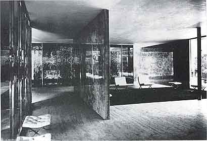 Les superfícies no són opaques, llevat del sostre, sino vibrants, el marbre fa aigues, i el vidre deixa passar la llum. Alguns marbres estan tallats fent efectes de mirall; no tenen les transparències del vidre però els plans que fan es veuen de les dues bandes, com en un efecte dequivalència o transparència. Així, la reversió, o simetria, és un element significatiu en lestructura del Pavelló, present a la naturalesa i disposició dels materials i a la dualitat dels màstils. Mies va dissenyar la cadira Barcelona pel Pavelló, posada al lloc central, damunt la catifa negra i mate: és una estructura que manifesta forçes diferents equilibrades, tan exquisida com tot ledifici, produida industrialment a partir dun estàndard. Recorregut.