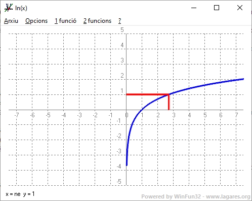 - La funció `ln(x)` per nombres més petits que `e`, son uns nombres més petits que `1` la qual cosa fa que a l'esquerra d'`e` la funció derivada:
