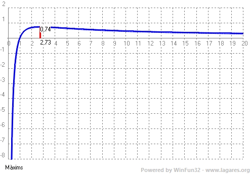 Tot plegat implica que en un punt,`x=e`, on la derivada val `0`, i la funció és creixent a l'esquerra i decreixent a la dreta, hi ha un màxim.