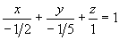 Aquesta última equació és diu canònica o segmentària. Només es pot calcular si tots els coeficients de les incògnites són diferents de 0. Té la propietat de que a diferència de les altres és unívoca i el número que hi ha a sota de cada incògnita és por on talla l'eix corresponent. Ho sigui -1/2 és por en talla el pla l'eix 0X (y = 0 ; z = 0). |