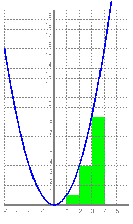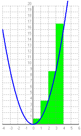 Podem aproximar l'àrea buscada fent la suma de les àrees dels següents rectangles: ![]() Això seria una aproximaxió per defecte. `0·1+1·1+1·4+1·9=14` ![]() Això seria una aproximaxió per excès. `1·1+1·4+1·9+1·16=30` Exercicis: 1- Calcula, tant per excès, com per defecte, l'àrea entre `x=0`, `x=4`, la funció, `x^2` i l'eix de les `x` fent servir `\Delta x = 0'5`. Quant val `n` en aquest cas?. 2- Calcula, tant per excès, com per defecte, l'àrea entre `x=0`, `x=10`, la funció, `x` i l'eix de les `x` fent servir `\Delta x = 1`. Quant val `n` en aquest cas?. 3- Calcula l'àrea entre `x=0`, `x=10`, la funció, `x` i l'eix de les `x`, fent servir propietats geomètriques del dibuix de la gràfica resultant. 4- Calcula l'àrea entre `x=0`, `x=10`, la funció, `x` i l'eix de les `x`, calculant el `lim_(n->+\infty) \sum_(i=1)^n x_i·\Delta x``. |