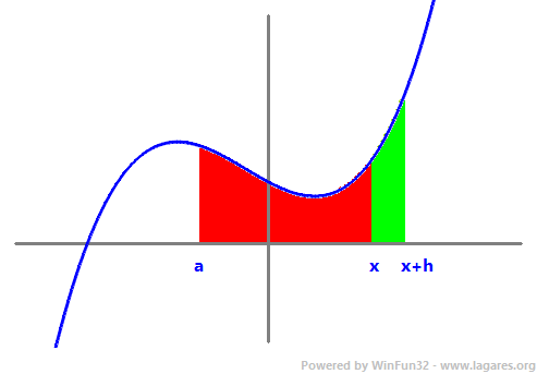 `F'(x) = f(x)` DEMOSTRACIĶ: ![]() `F'(x) = lim_(h->0) (F(x+h)-F(x))/h` `F'(x) = lim_(h->0) (\int_a^(x+h)f(t)dt-\int_a^xf(t)dt)/h` `F'(x) = lim_(h->0) (\int_a^(x)f(t)dt+\int_x^(x+h)f(t)dt-\int_a^xf(t)dt)/h` `F'(x) = lim_(h->0) (\int_x^(x+h)f(t)dt)/h` `<` `<` ![]() `f(x)ˇh < \int_x^(x+h)f(t)dt < f(x+h)ˇh ` `(f(x)ˇh)/h < (\int_x^(x+h)f(t)dt)/h < (f(x+h)ˇh)/h ` `f(x) < (\int_x^(x+h)f(t)dt)/h < f(x+h) ` `lim_(h->0)f(x) < lim_(h->0)(\int_x^(x+h)f(t)dt)/h < lim_(h->0)f(x+h) ` `f(x) < F'(x) < f(x) ` `F'(x) = f(x) ` |
